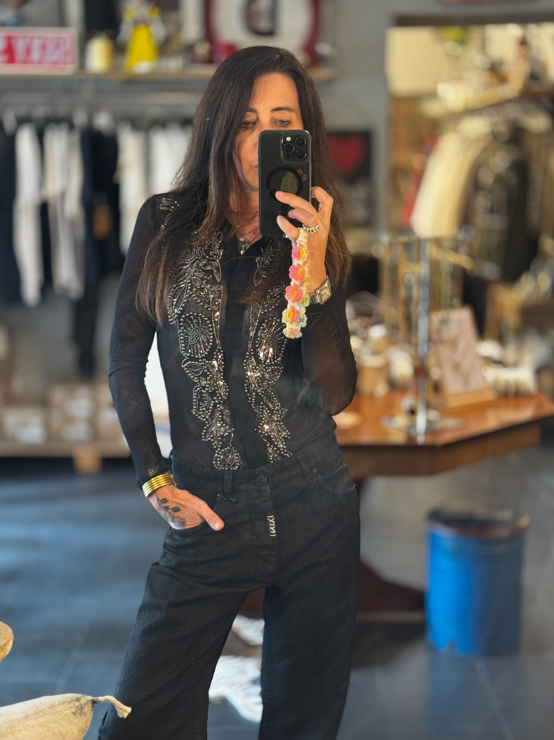 Camicia body in tulle con applicazioni sul davanti